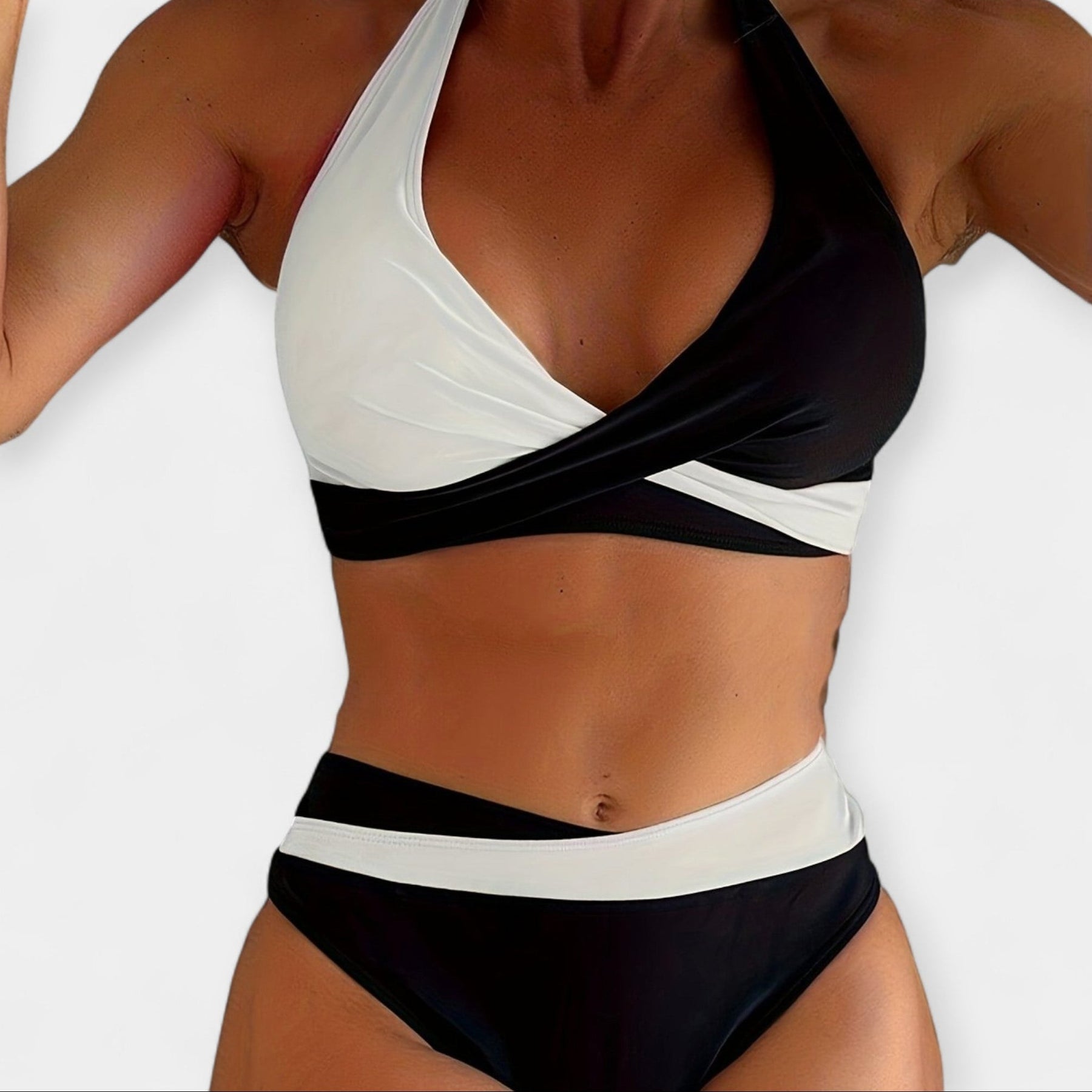 Αυτό το σέξι μπικίνι δύο κομματιών εντυπωσιάζει με τη λιτή του γραμμή και τη σταυρωτή λεπτομέρεια στο ντεκολτέ. Αναδεικνύει τη θηλυκότητα με διακριτικό τρόπο, ιδανική για κομψές εμφανίσεις στην παραλία ή τις καλοκαιρινές σου αποδράσεις.