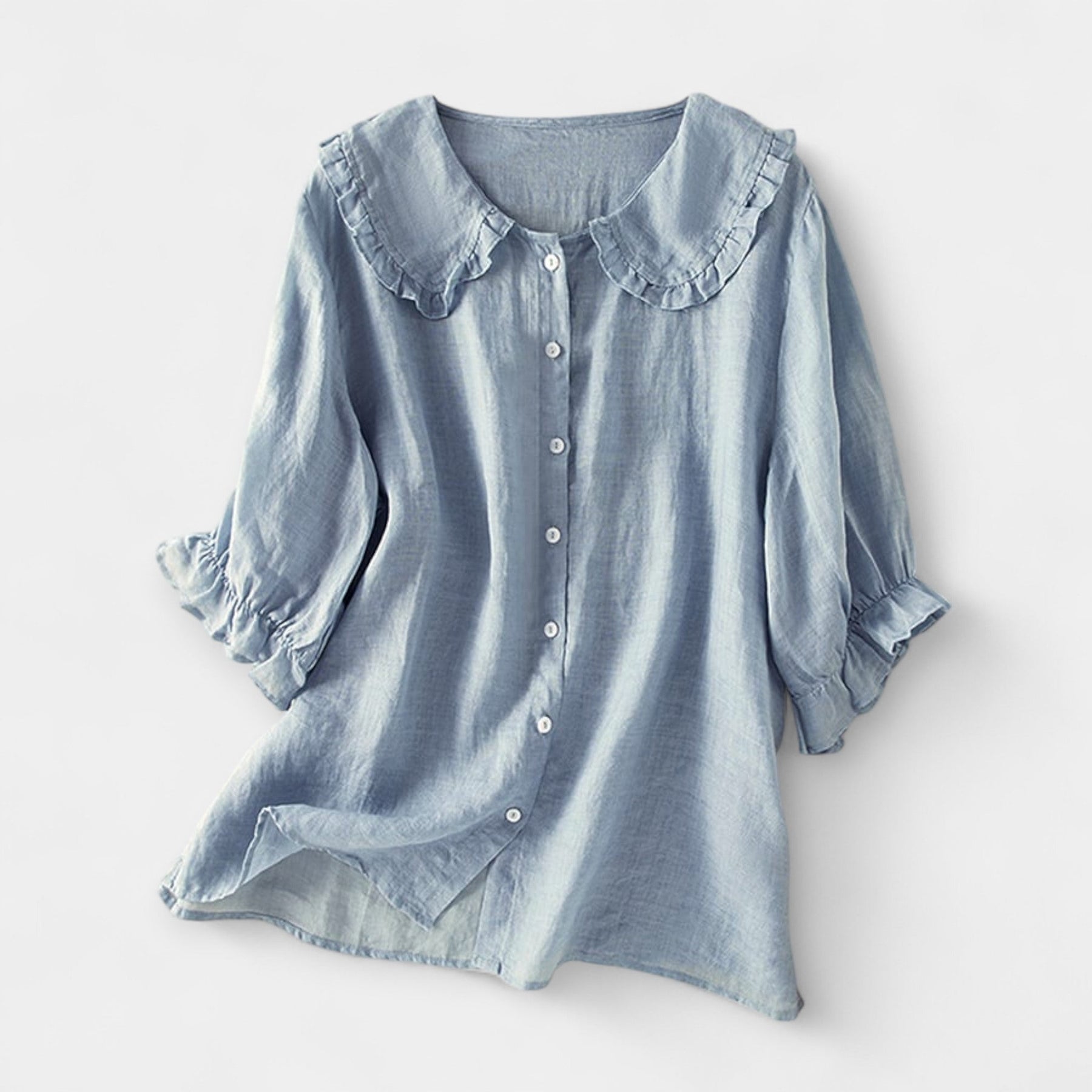 Ένα παιχνιδιάρικο πουκάμισο από ανάλαφρο μείγμα βαμβακιού και λίνου που συνδυάζει κομψότητα και άνεση. Ο γιακάς Peter Pan με βολάν προσθέτει μοναδική λεπτομέρεια που αναβαθμίζει κάθε casual εμφάνιση, ιδανική για φούστες ή παντελόνες.
