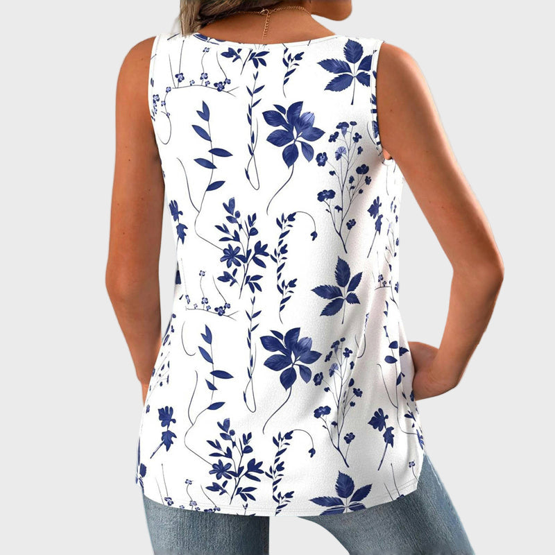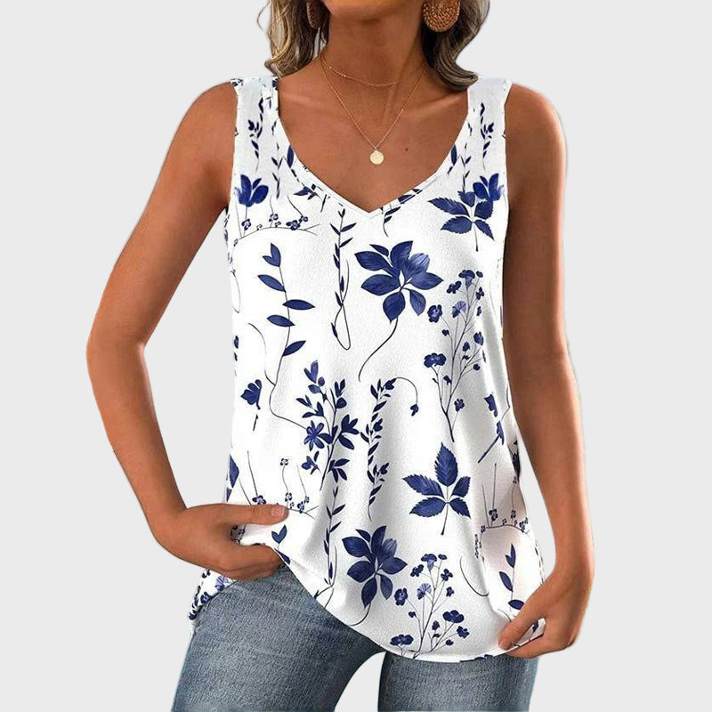 Απολαύστε τη φρεσκάδα του καλοκαιριού με αυτό το αμάνικο τοπ σε λευκή βάση, διακοσμημένο με μπλε λουλούδατα μοτίβα. Η χαλαρή γραμμή του προσφέρει άνεση και ελευθερία κινήσεων, ενώ το ντεκολτέ σε σχήμα V χαρίζει θηλυκότητα και κομψότητα. Ένα ιδανικό κομμάτι για καθημερινές και καλοκαιρινές εμφανίσεις.