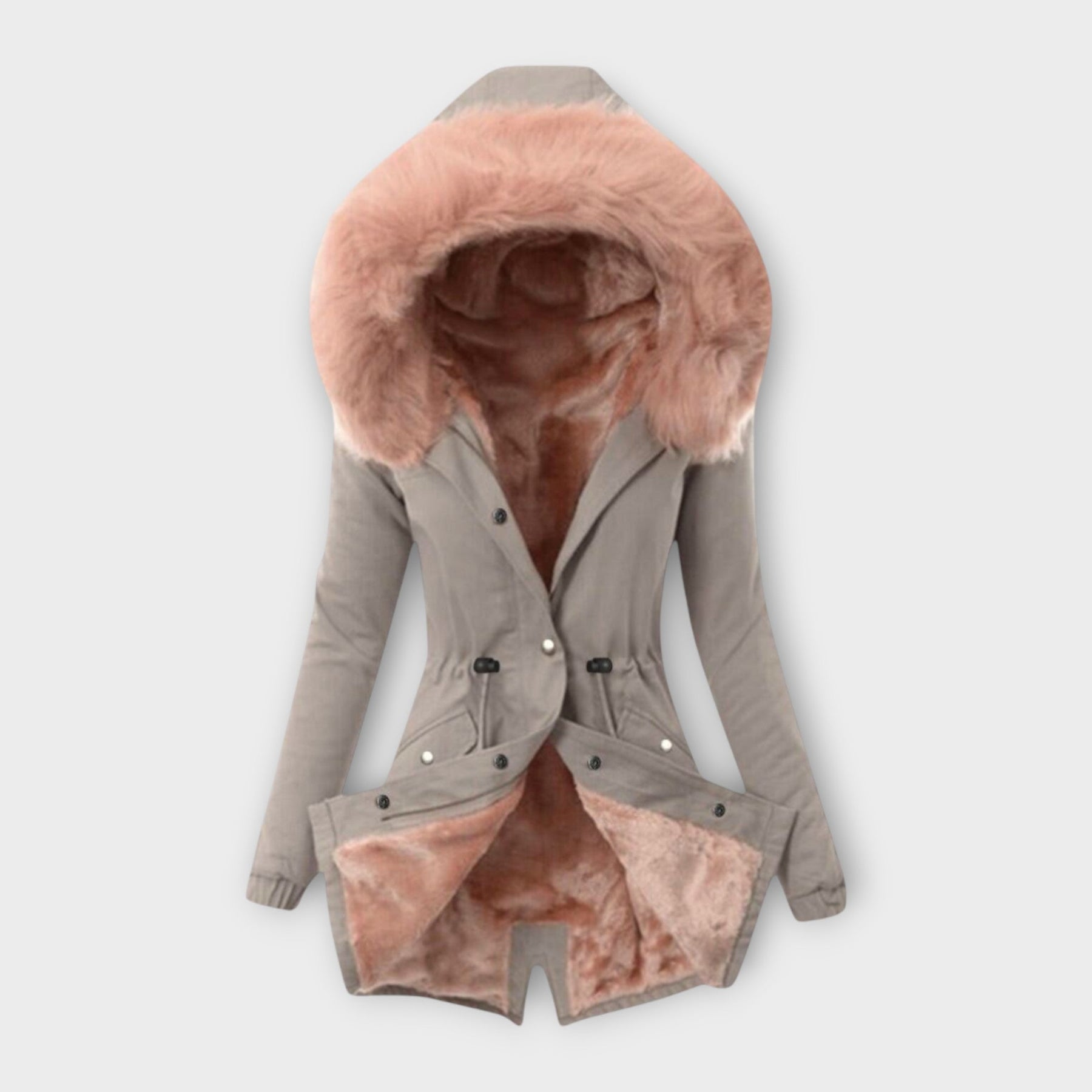 Η γενναιόδωρη κούκουλα είναι περιμετρικά επενδεδυμένη με μαλακή τεχνητή γούνα, που όχι μόνο προστατεύει από τον άνεμο και τις καιρικές συνθήκες, αλλά προσθέτει και μια αίσθηση κομψότητας.