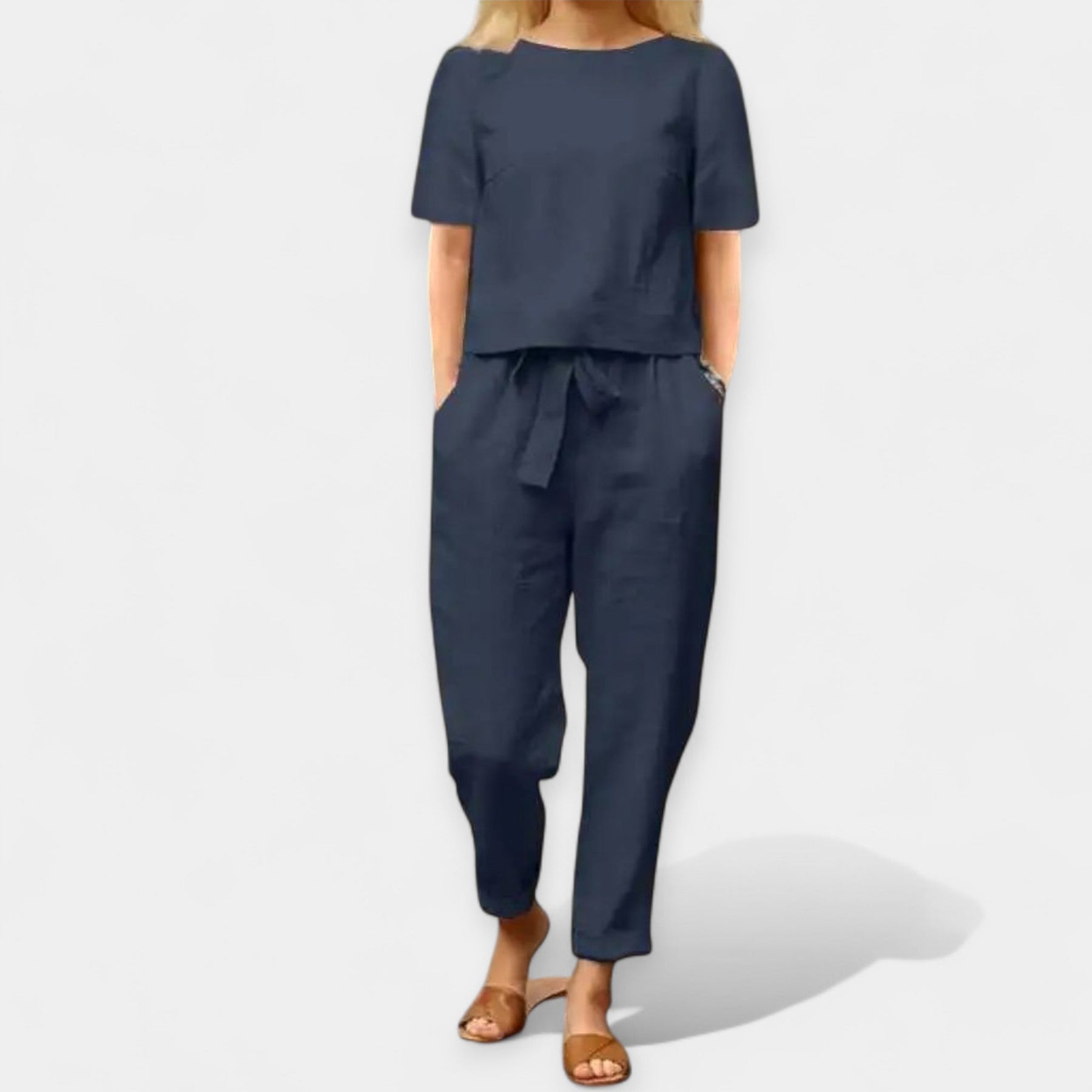 Ανανέωσε τη θερινή σου γκαρνταρόμπα με αυτό το κομψό και άνετο δίχρωμο σετ, ιδανικό για τις ζεστές μέρες και τις δροσερές βραδιές. Αποτελείται από μια ελαφριά μπλούζα και παντελόνα με φαρδιά γραμμή και κορδόνι, προσφέροντας άνεση και στυλ σε κάθε περίσταση.