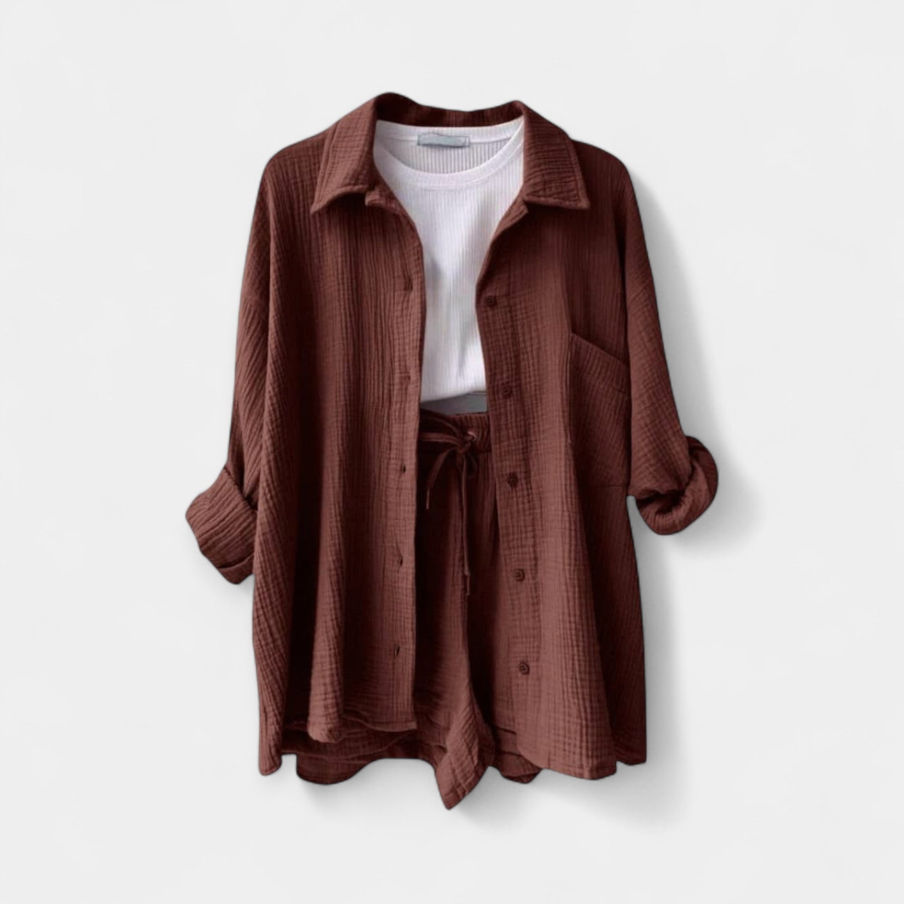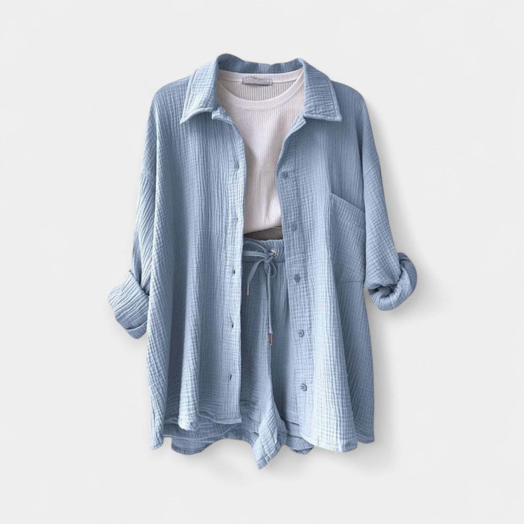 Ένα ανάλαφρο και κομψό σετ για τις πιο ζεστές μέρες του χρόνου. Ιδανικό για στιγμές δίπλα στην πισίνα, βόλτες ή καλοκαιρινές αποδράσεις με στιλ και άνεση.