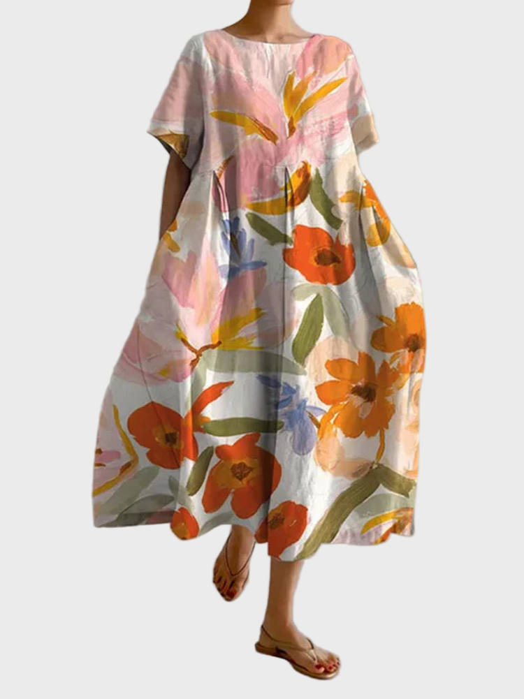 Ο Ανθισμένος Καμβάς είναι ένα φόρεμα που μοιάζει με έργο τέχνης, γεμάτο χρώματα και ζωντάνια. Οι έντονες λουλουδένιες πινελιές σε πορτοκαλί, ροζ, κίτρινο και μπλε μια εντυπωσιακή εμφάνιση που αποπνέει φρεσκάδα και θηλυκότητα.