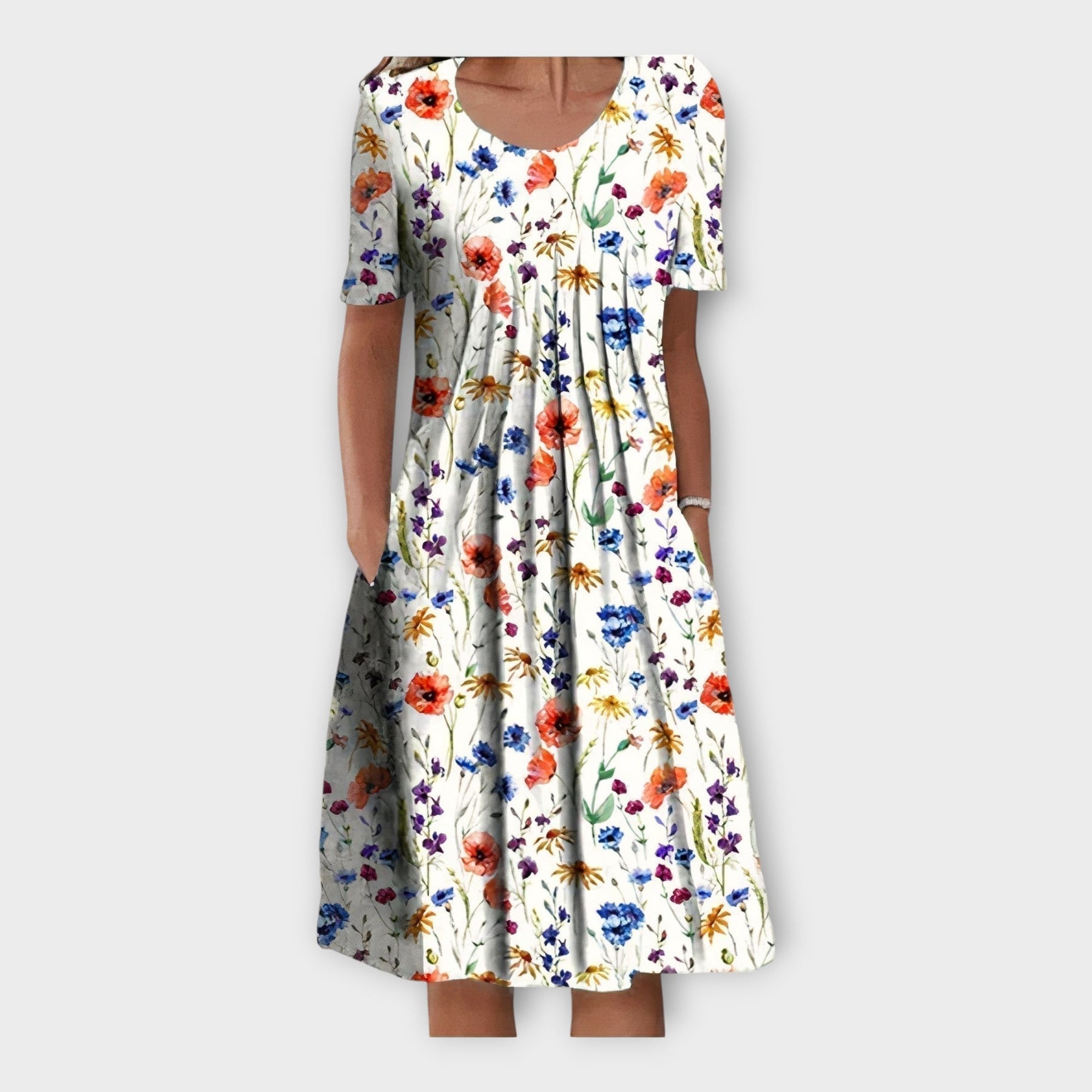 Αυτό το φόρεμα με λουλουδάτο σχέδιο προσφέρει μοναδική αίσθηση ελευθερίας και θηλυκότητας. Με άνετη γραμμή, κοντό μανίκι και τσέπες που προσθέτουν πρακτικότητα, αποτελεί ιδανική επιλογή για βόλτες, καφέ ή καθημερινές δραστηριότητες με στυλ.